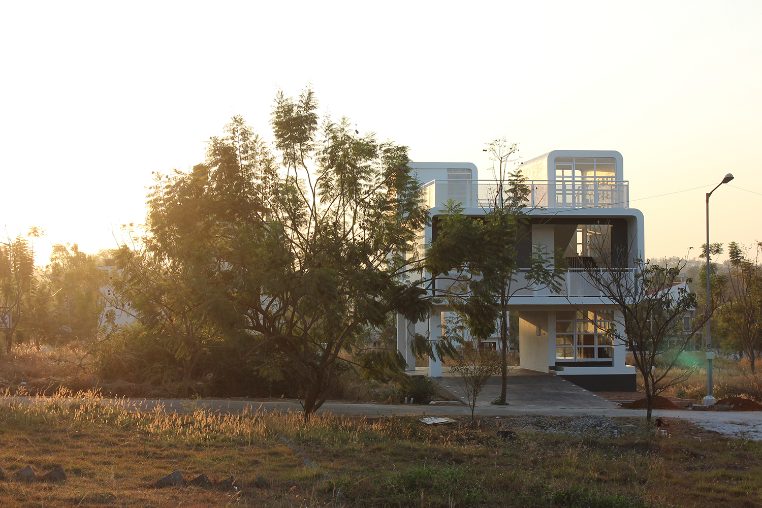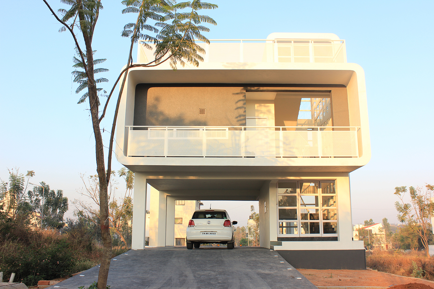 This building revolves around the concept of creating boundaries that do not intimidate the viewer rather enhances the experience of how a villa design can occupy less amount of space and yet create comfort and exhibit elegance. The villa as desired by the client works on the concept of sufficiency and serves the purpose of being a retreat home for a mature couple. The dominant colour pallet of the house is white with hues of grey that strikes a contrast to its colourful surroundings. The mould of the Villa can be perceived to be integrated cuboids that creates volumes through its blends that soften the edges of the structure, this in spite of the regional variance provides a sense of joy when perceiving the space.