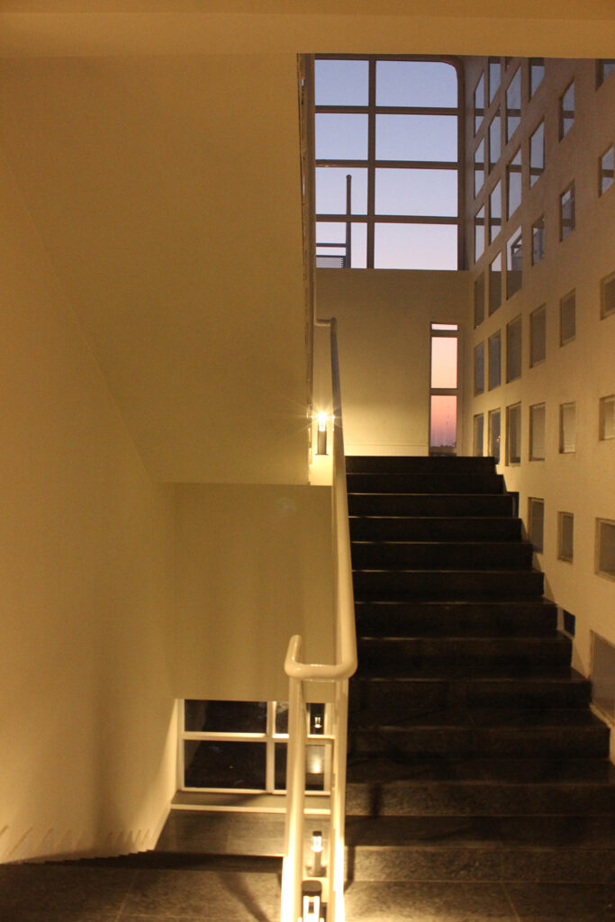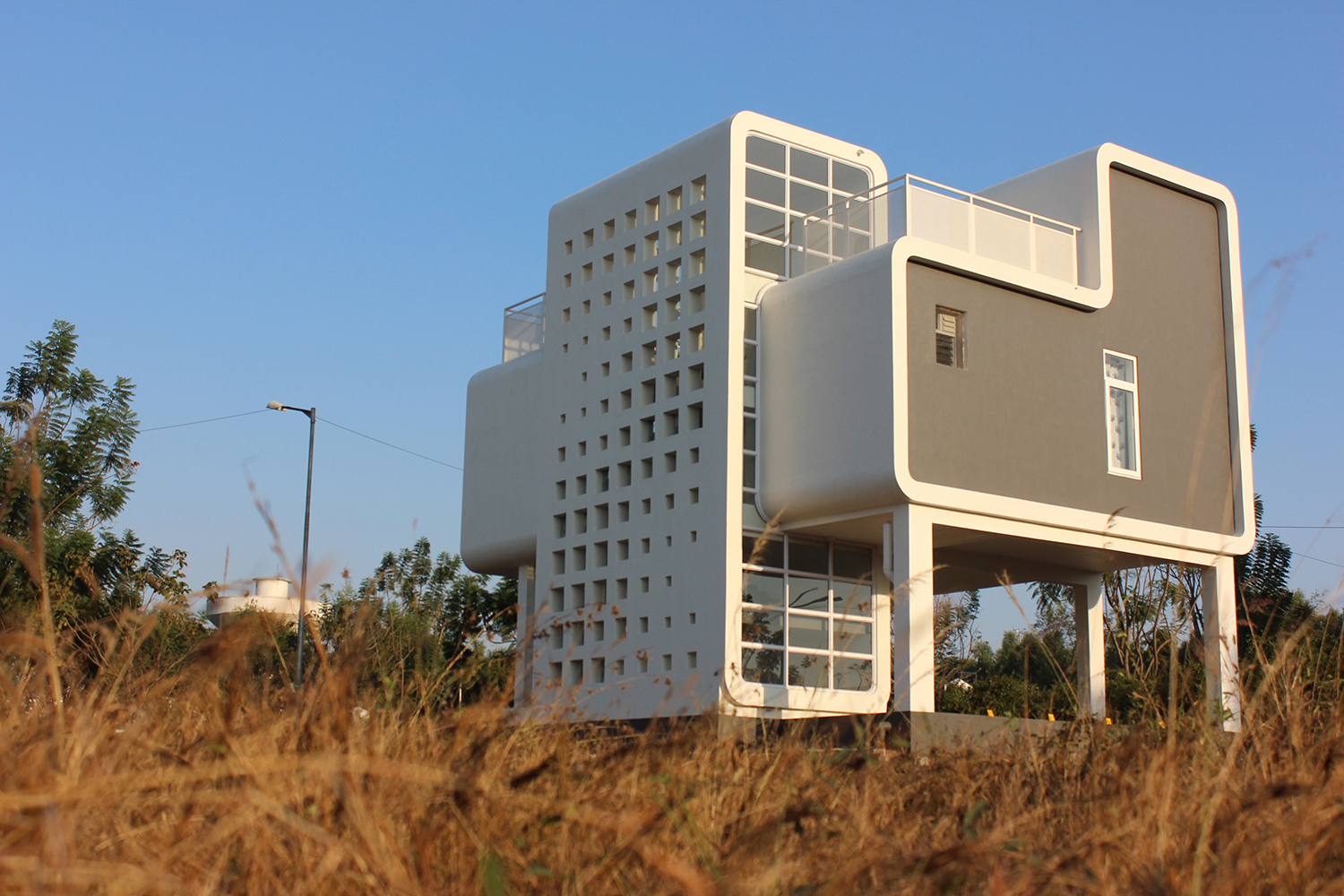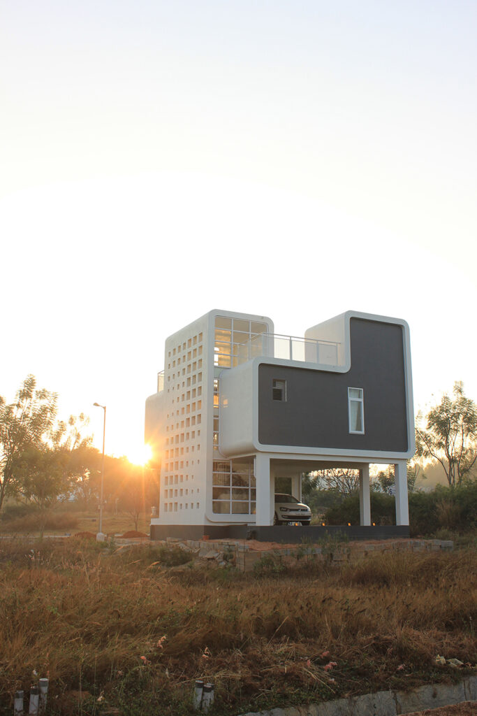 The ground floor of the building constitutes of parking space shaded by the cuboidal structure and a secured access to the staircase with the entry wall patterned in cubic openings trailing rhythm through the space, these openings blend into the exterior which provide striking rays of light and is inclusive of the exterior.