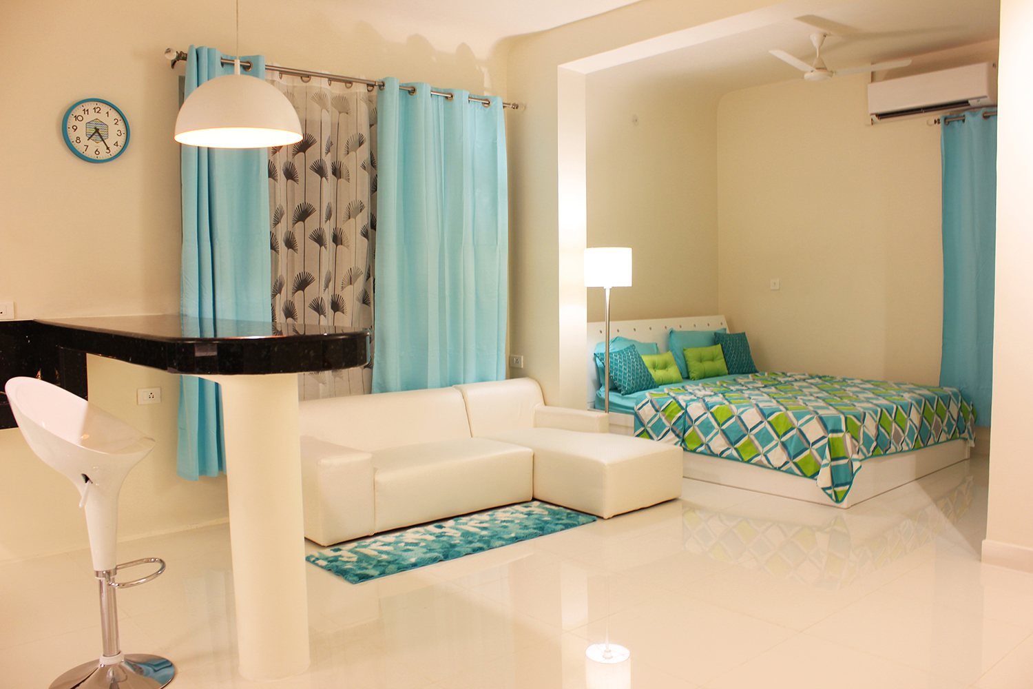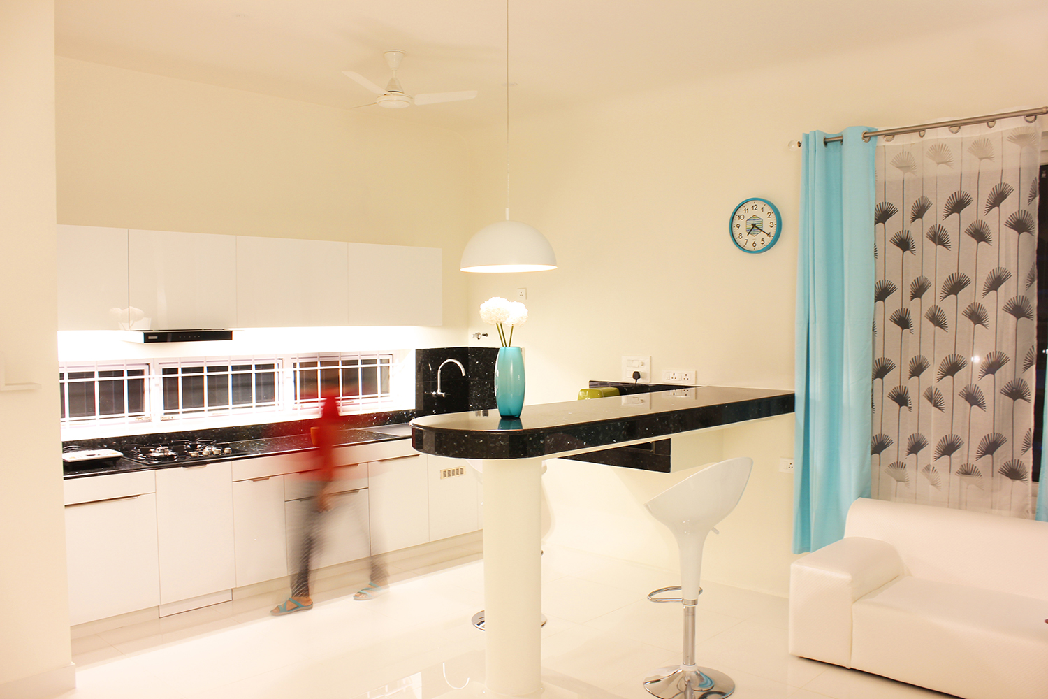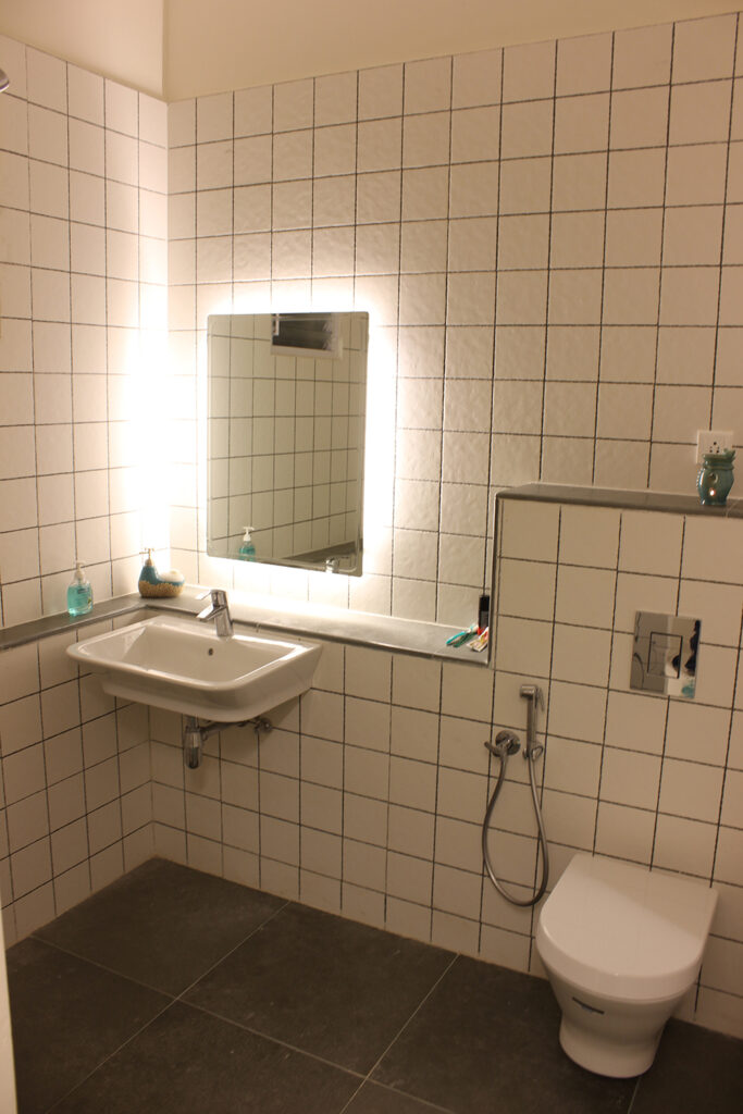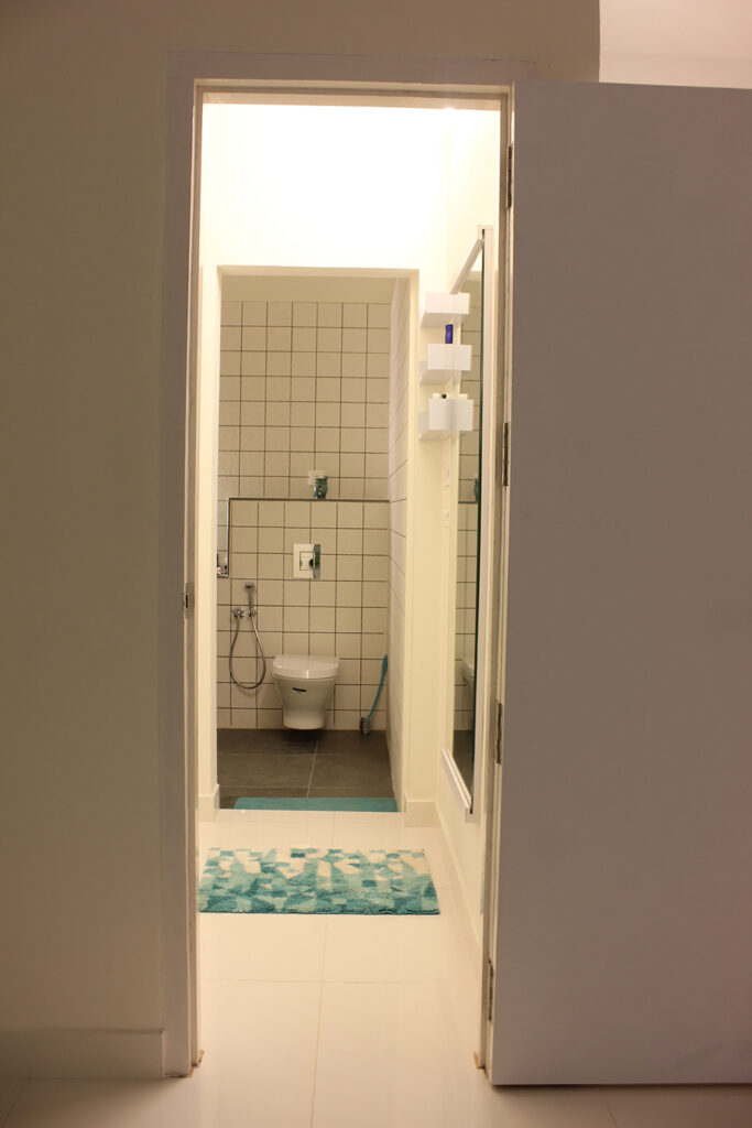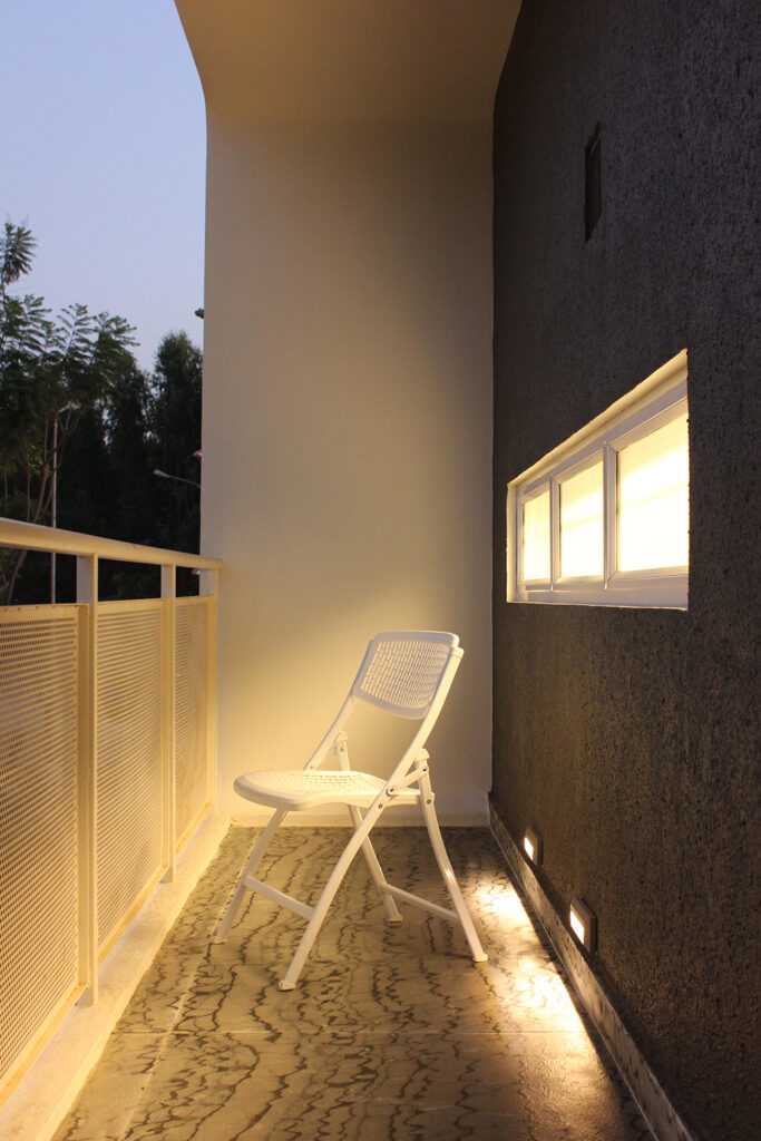 The first floor has a portico that leads to the entrance of the house. The Studio Villa has sufficient series of spaces – The island kitchen preceding to the hall and further to the bedroom with a secluded toilet by means of a walk-in closet. The concept of the interior spaces is derived from the primitive traditional houses of Southern India, Kudusai Veedu (Hut homes) these houses reflect the compactness and needfulness of the space and an aesthetic approach to the client’s roots.